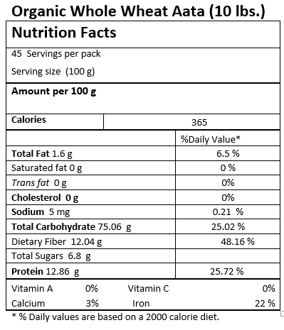 Benefits : Source of Carbohydrates - Whole Wheat flour is a good source of carbohydrates, which acts as a fuel to provide energy for day to-day work. Most of the carbohydrate in Whole Wheat flour is in the form of Starch. These long chain molecules take longer to digest than simple sugar which is present in low amounts in it. Fiber – Since the whole wheat grain is used to prepare the flour, it naturally contains a good amount of dietary fiber (mostly present in bran and germ). Soluble fiber lowers cholesterol and prevents diabetes while insoluble fiber helps to add bulk in food, making it easy to move through the digestive tract. Nutrients - Whole wheat flour provides many vitamins including folates, riboflavins, Vitamin B-1, B-3 and B-5. Many minerals are found in it including magnesium, manganese, selenium, copper, etc. that help in various bio-functions in the body. Lowers chances of Diabetes- Flour prepared from organic whole wheat grains considerably lowers the risk for type 2 diabetes and helps in keeping the gastrointestinal function normal. Uses: • It can be used to prepare breads, roti, chapatis, poori, sheera, flatbreads, pastas, cookies and other baked products. • 100% ORGANIC • NO GMO, NO CHEMICALS, NO PESTICIDE • INDIA ORGANIC, USDA CERTIFIED Organic Whole Wheat Flour SKU: 8906070438335 PriceFrom $6.99 Weight* Select Quantity* 1 Out of Stock Notify When Available
